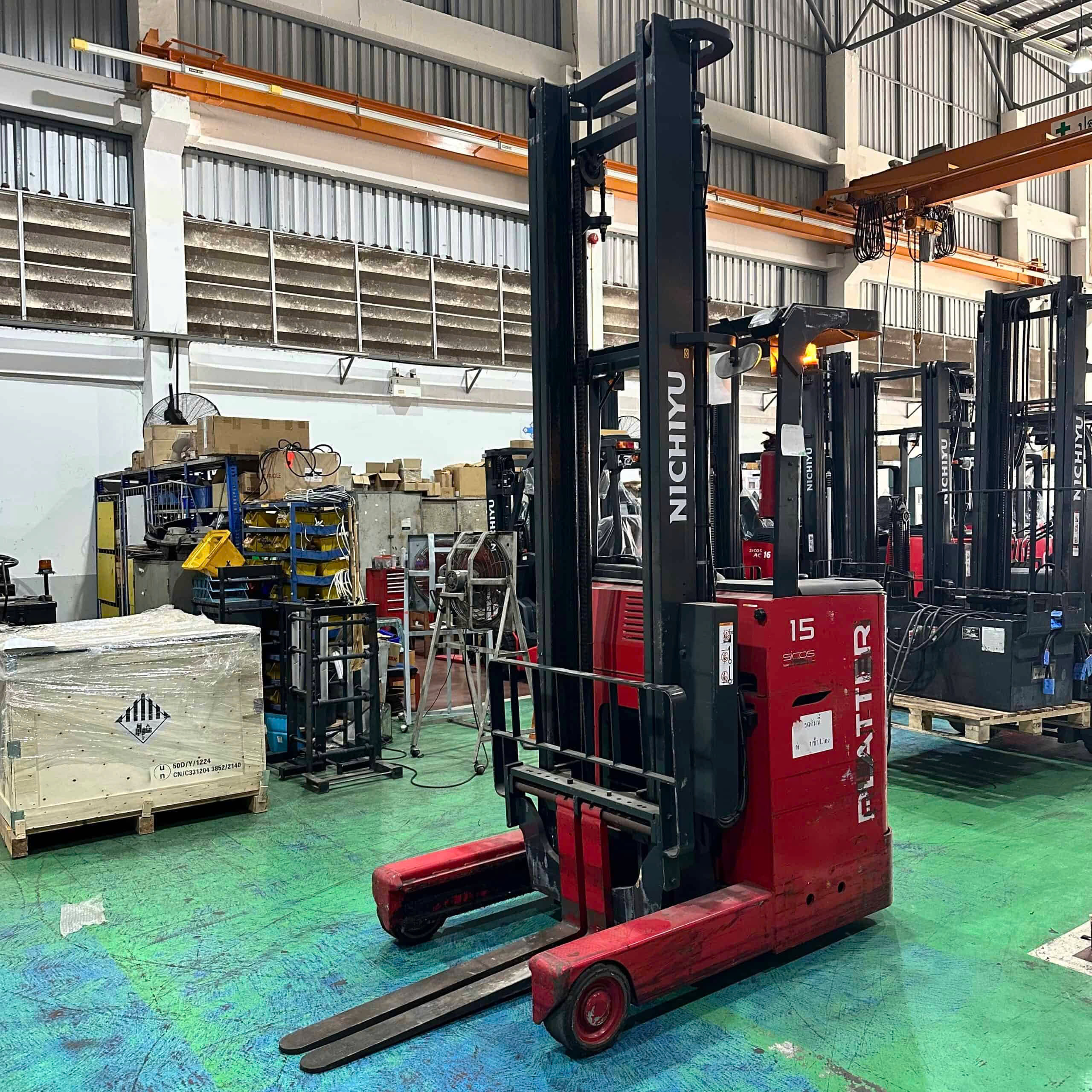 Xe nâng điện reach truck Komatsu: Được trang bị càng vươn xa, rất phù hợp với kho hàng nhiều tầng kệ.