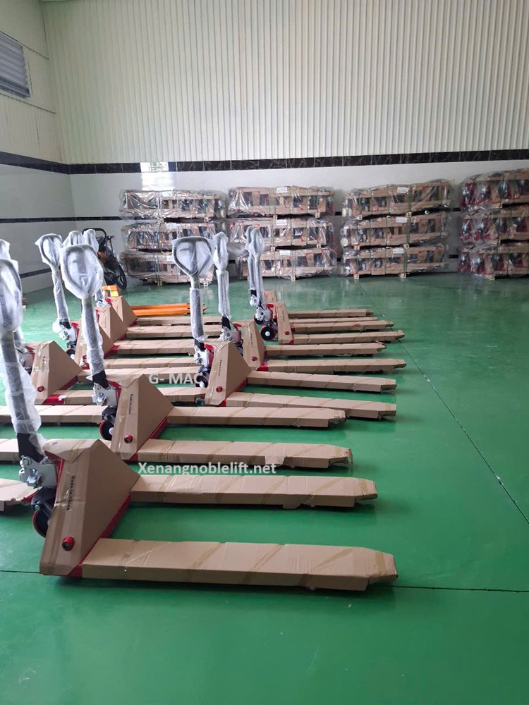 - Xe nâng tay thấp càng dài: Dùng cho pallet kích thước lớn, thường có chiều dài càng từ 1.5m trở lên.